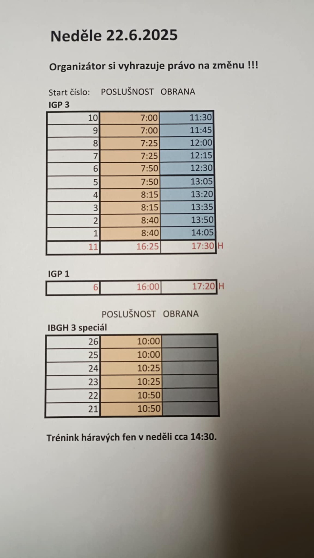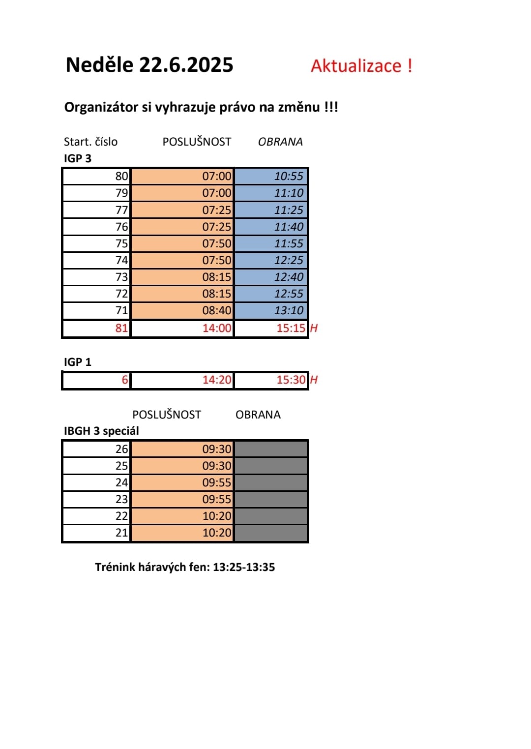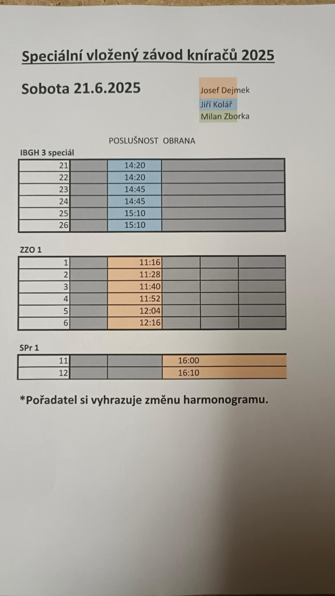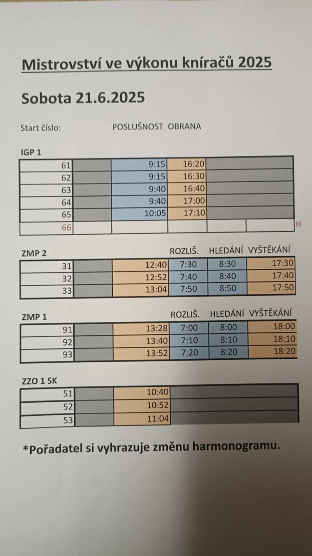 - Organizátor si vyhrazuje nárok na upravení časového harmonogramu v průběhu Mistrovstvím ČR ve výkonu kníračů 2025 s vloženým speciálním závodem .